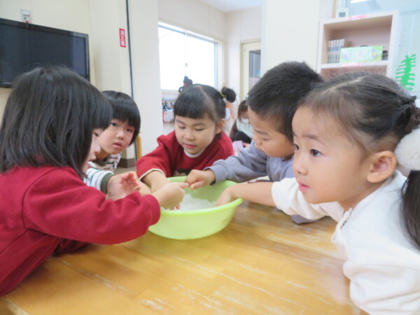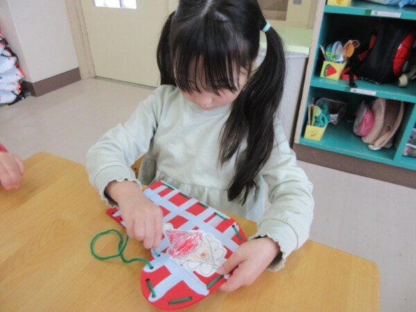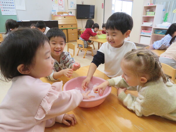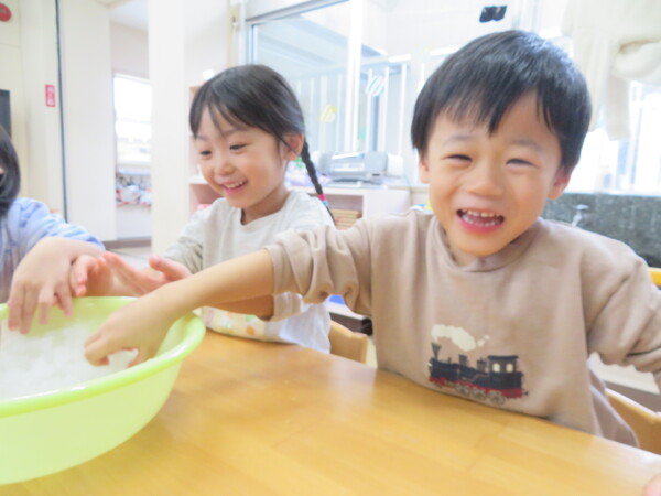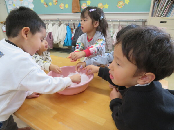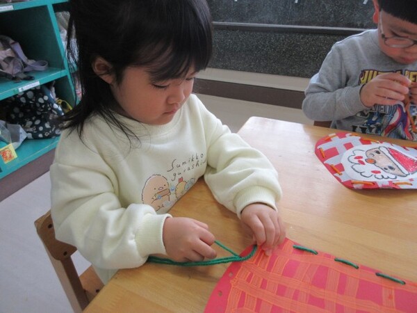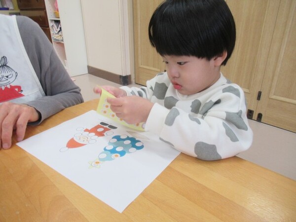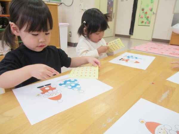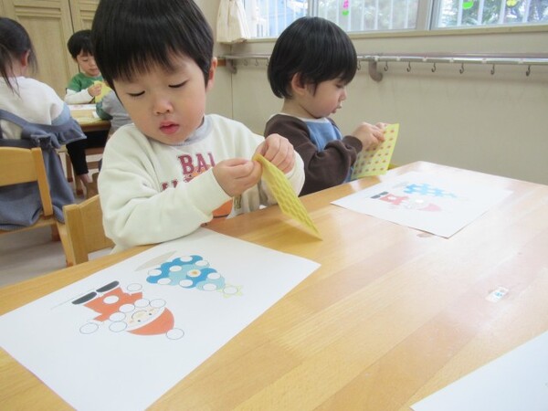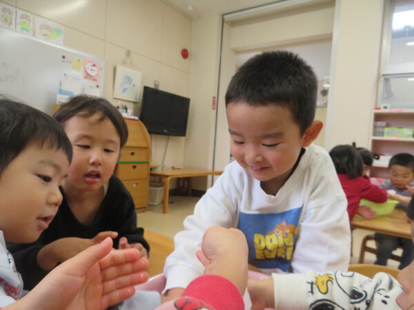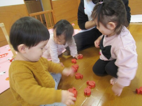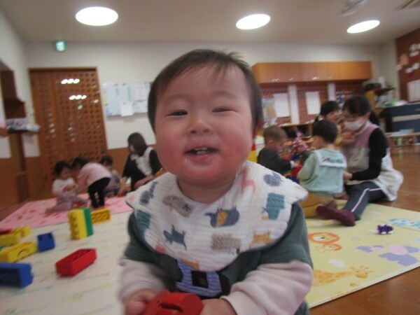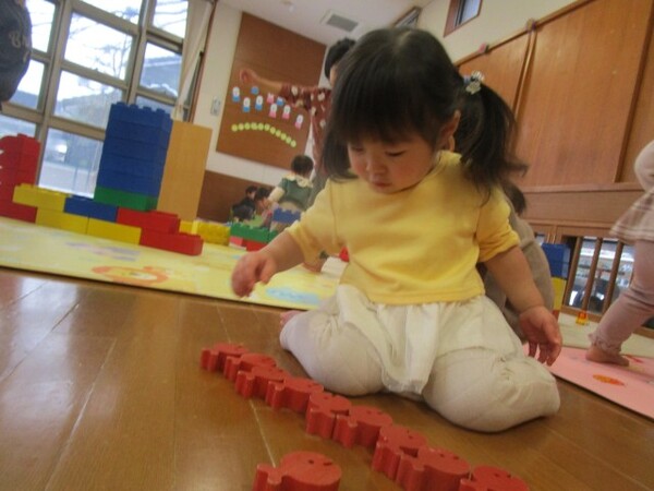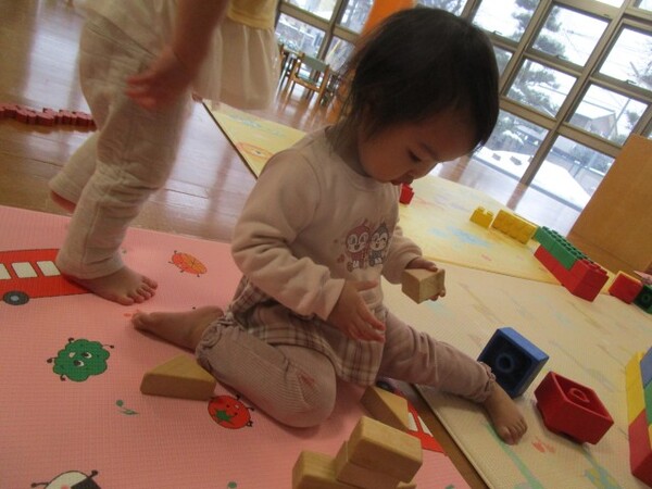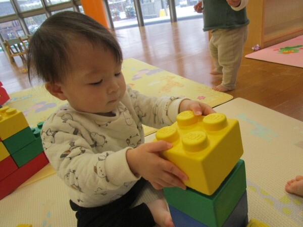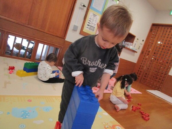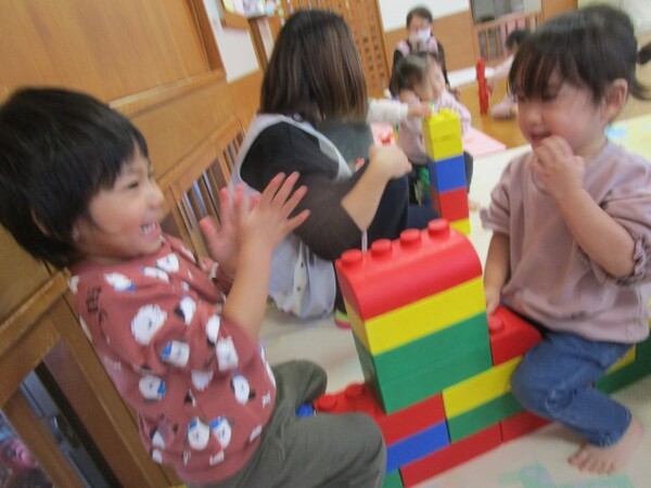 積み木では、高く積み上げたり、たくさん並べたり、こちらでもお友だちと一緒に楽しむ姿が見られました。