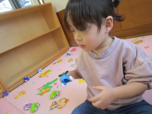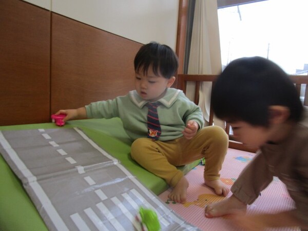 最初は、坂道に登って遊んでいた子どもたちでしたが「車さんを上において押すと早く進むよ!」と伝えると上手に車を走らせていました。