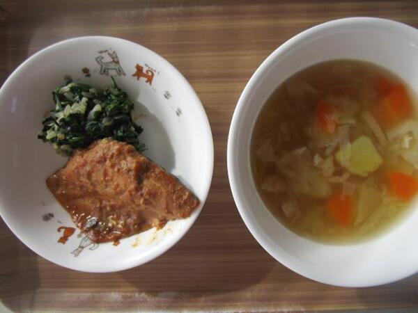 今日の給食は「鶏肉のオーブン焼き・ブロッコリーサラダ・野菜スープ」で〜す!