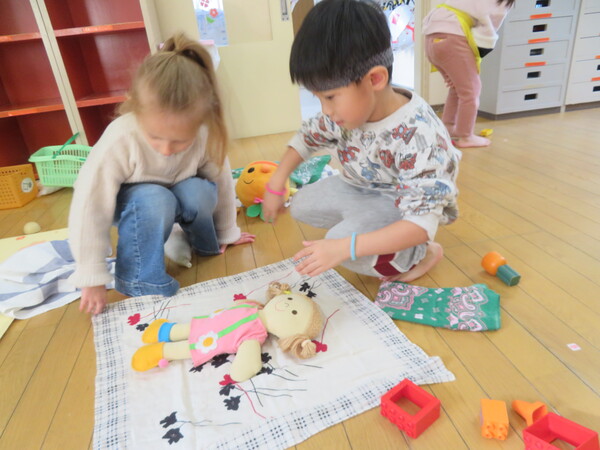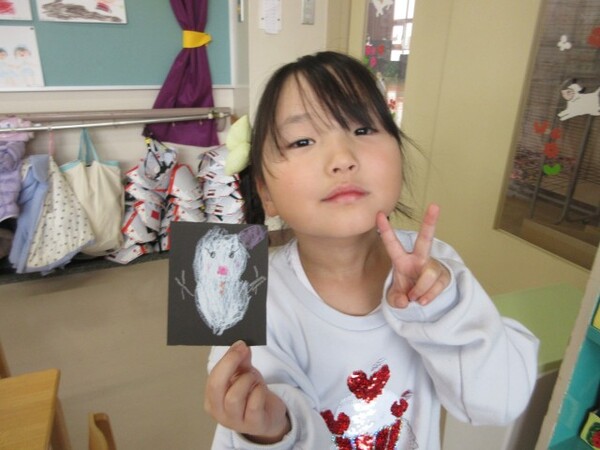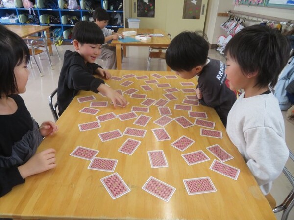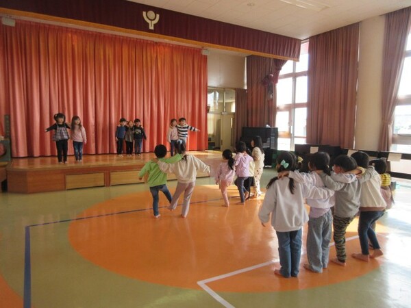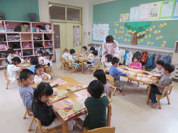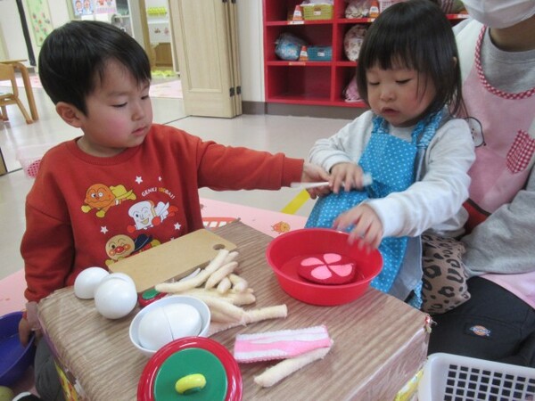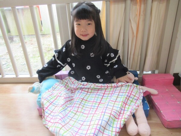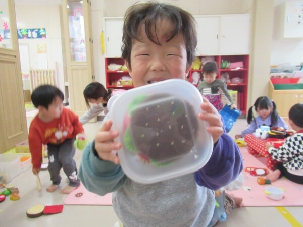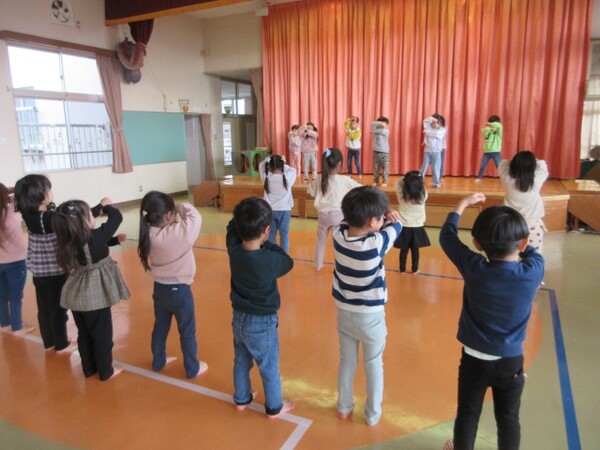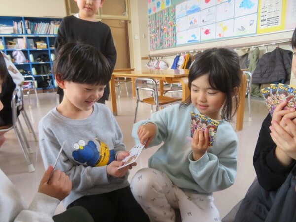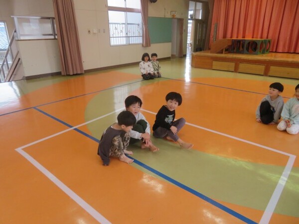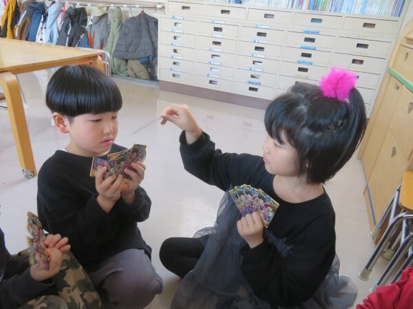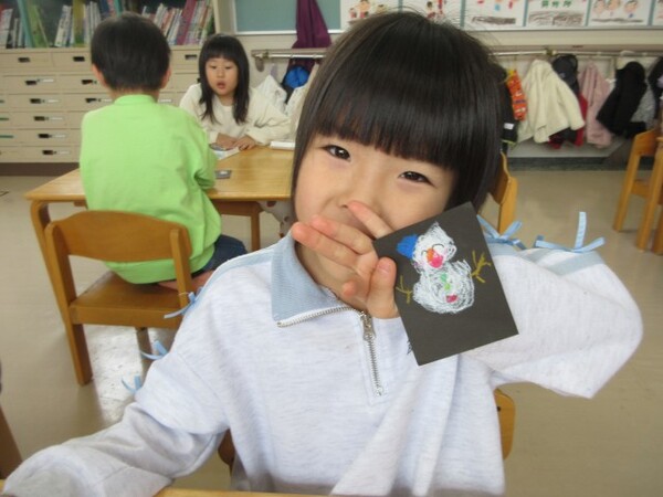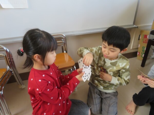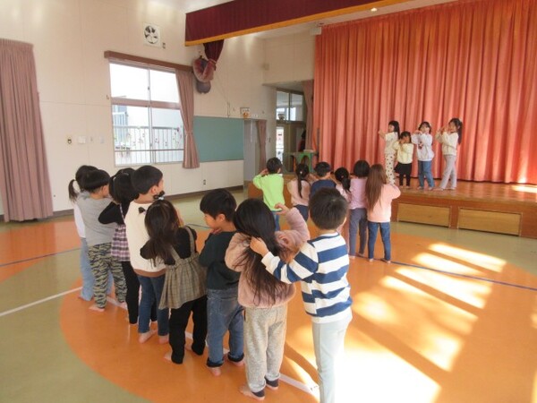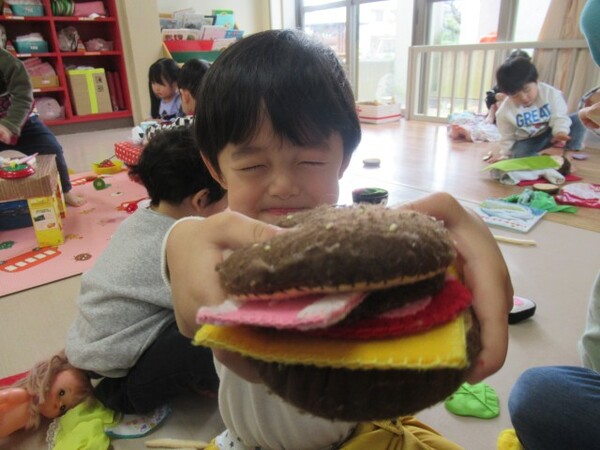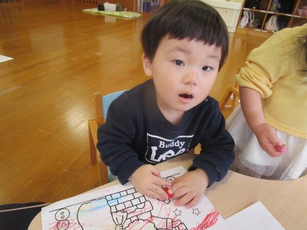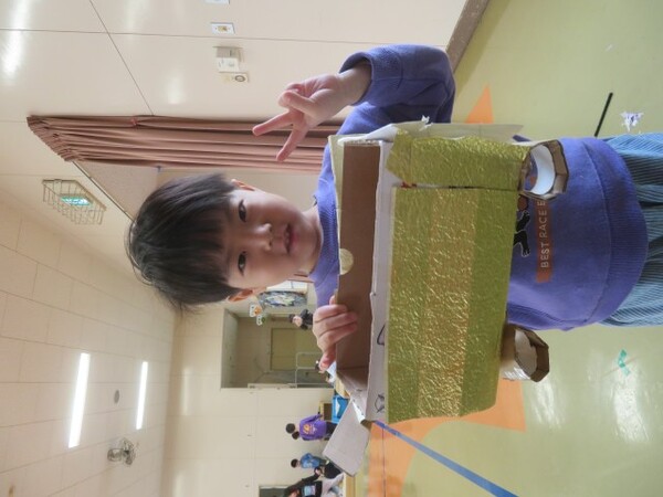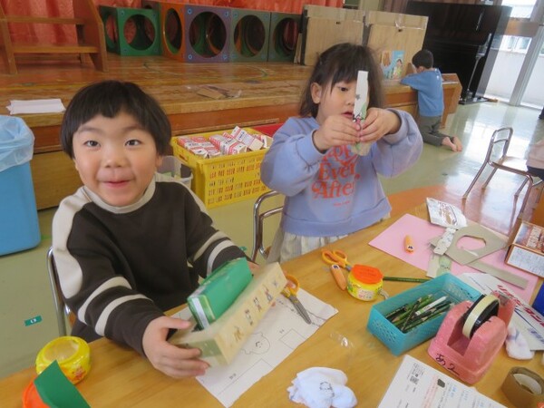 今日が初めての工作コーナーだったので、あやめ組さんはひまわり組さんの様子を見る日でした。完成した作品をあやめ組さんに紹介すると「すご〜い」という声が聞こえました。