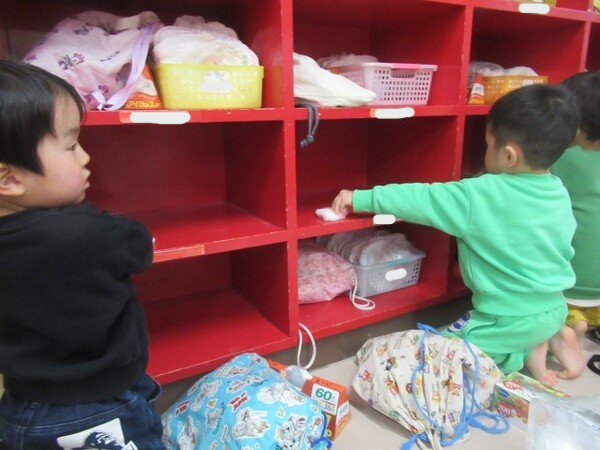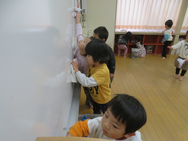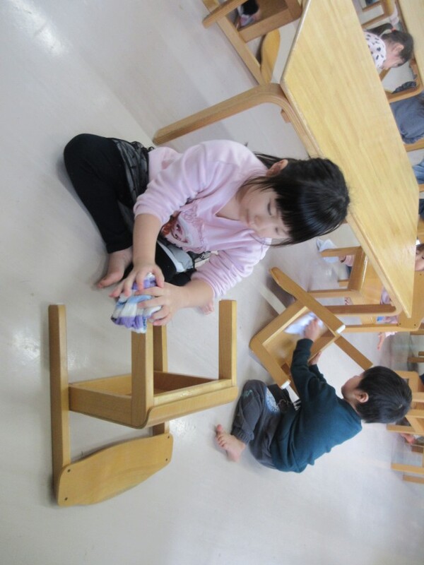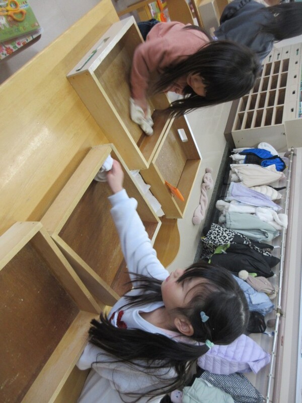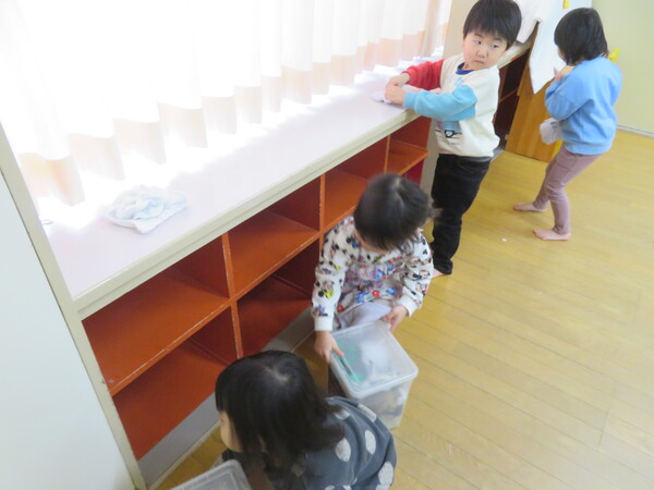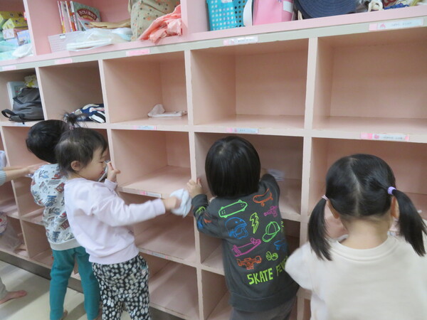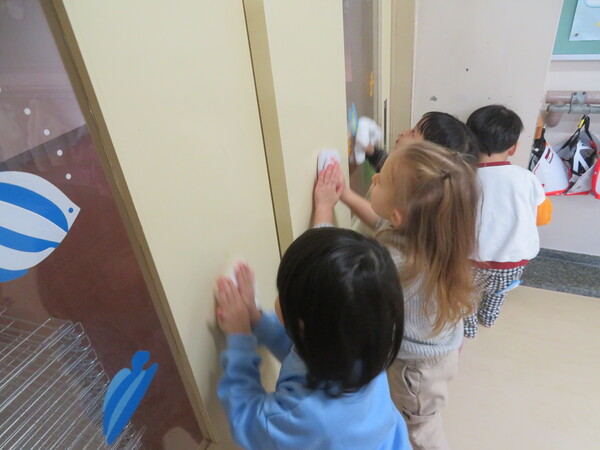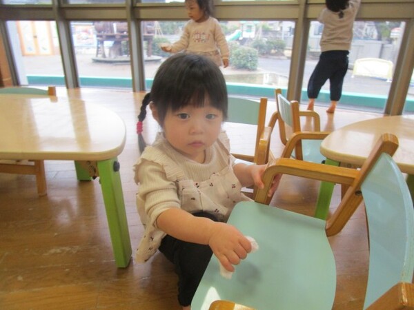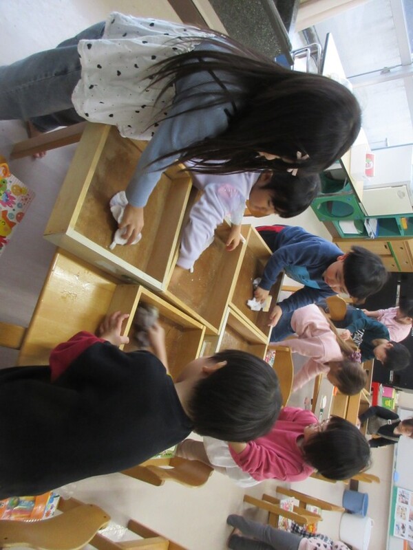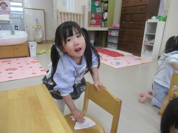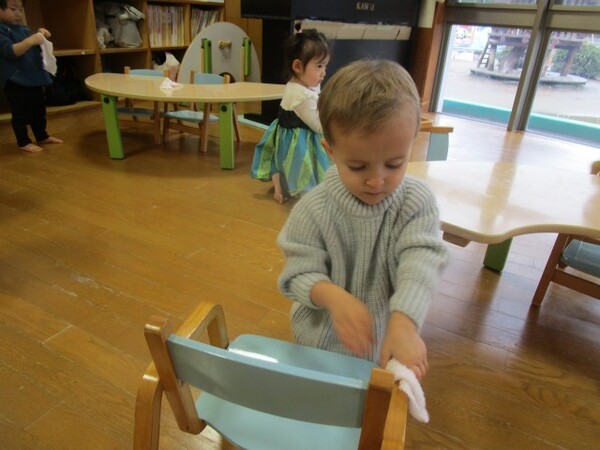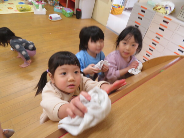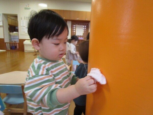 しっかりと保育士の拭き方や拭く所を見て、拭きやすいように布巾を持ち替えながらいろいろな場所をキレイにしてくれました☆
