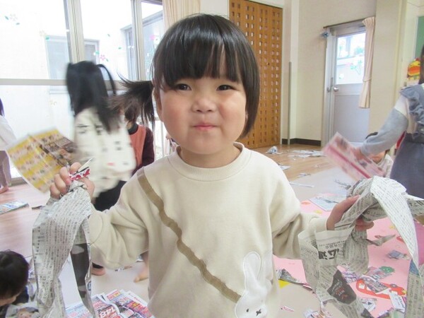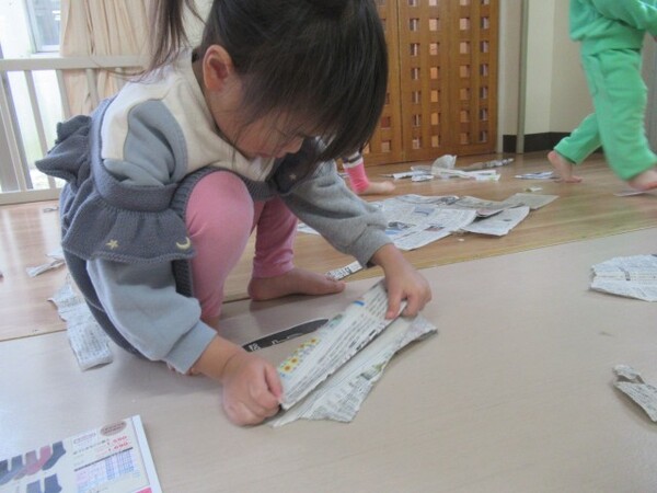保育士がちぎりやすいように切り込みを入れ、手本をみせると上手にちぎり、様々な大きさ・形ができあがりました。