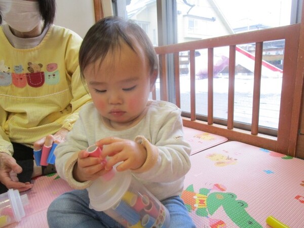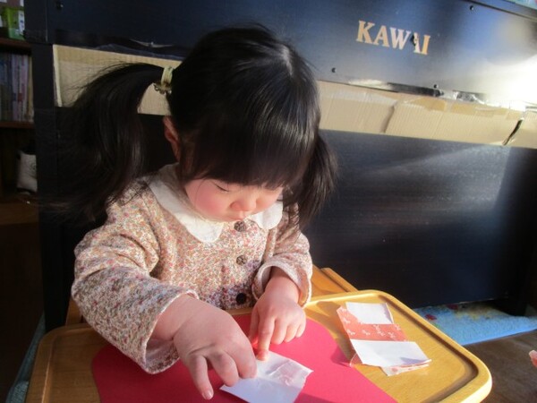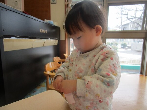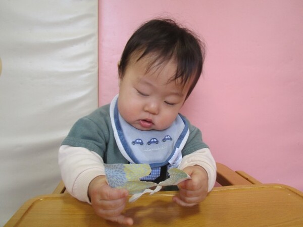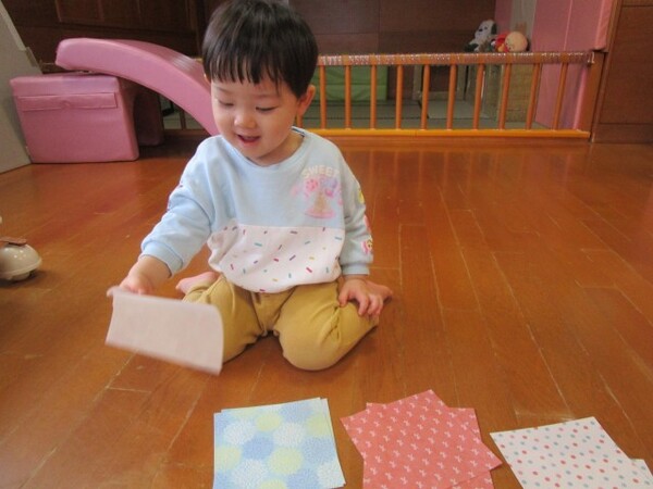「のりだよ、少し触ってみる??」と聞くと、ツンツンしたり、少しひろげてみたりして、のりの感触を楽しんでいました♪