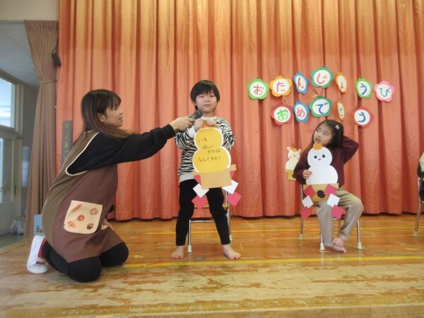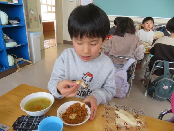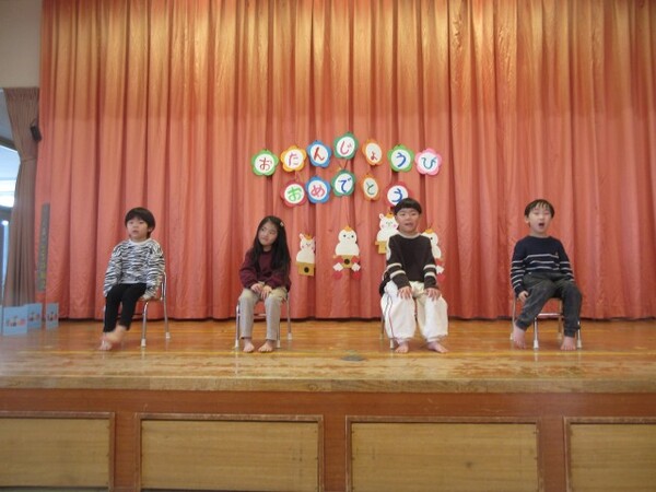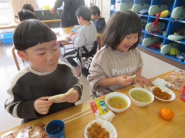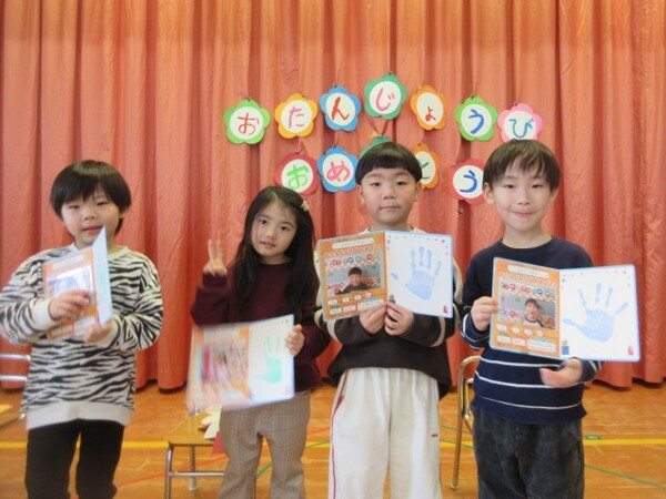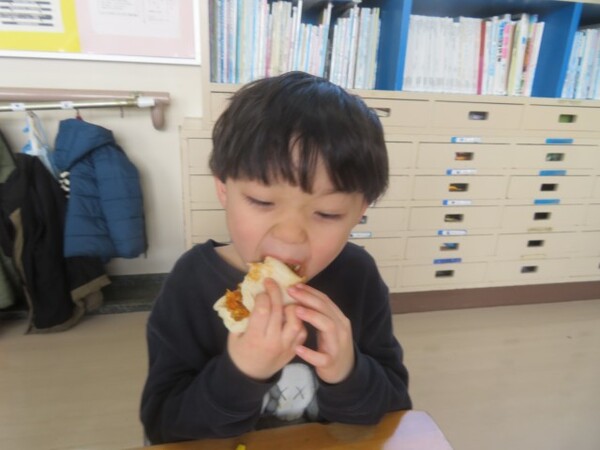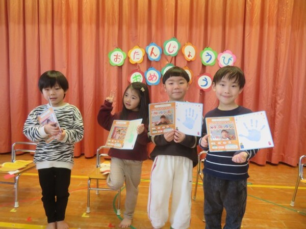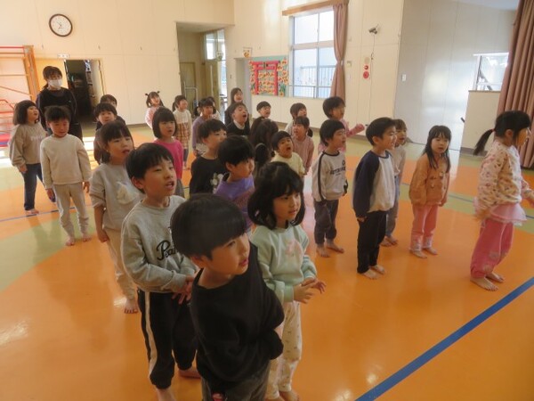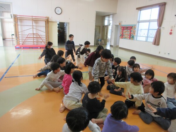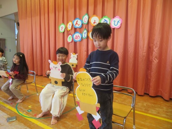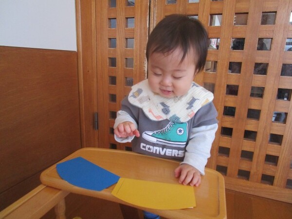 今日は、青・赤・黄色の画用紙から鬼の色を、6色のお花紙から2色選んでもらい、鬼に髪の毛をつけました。
