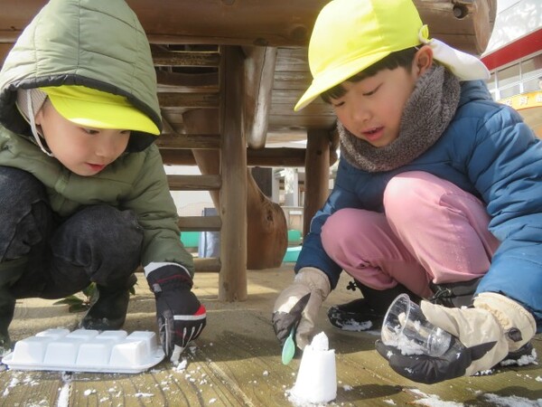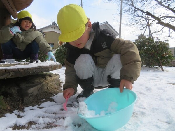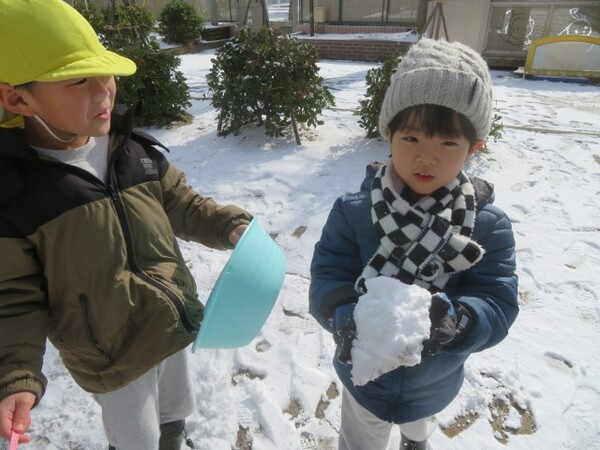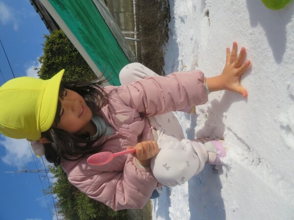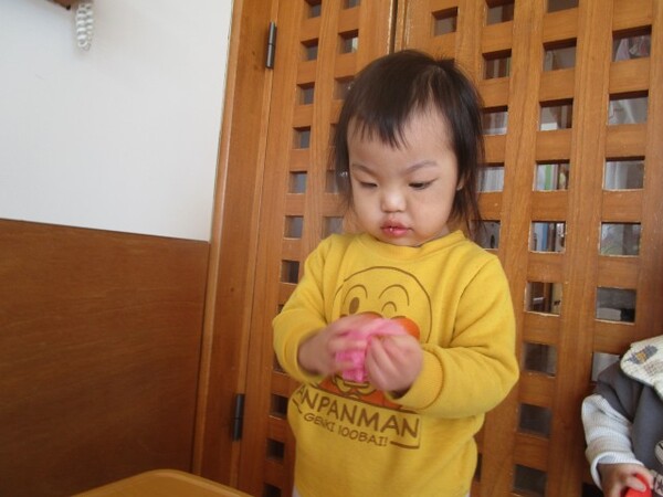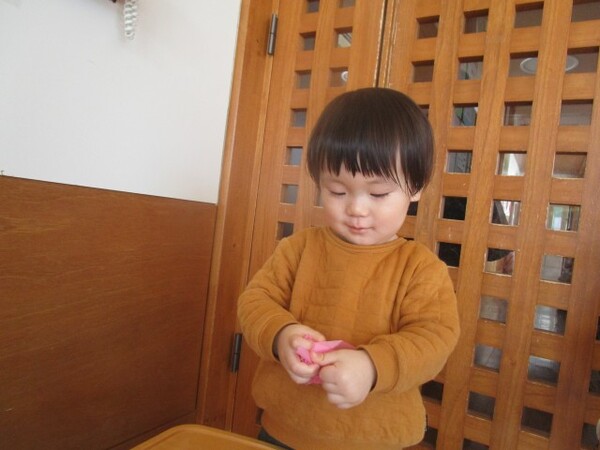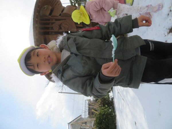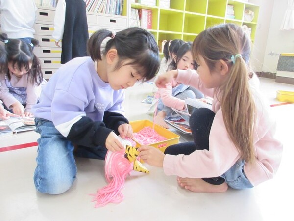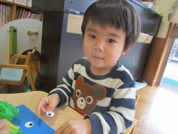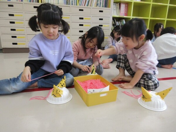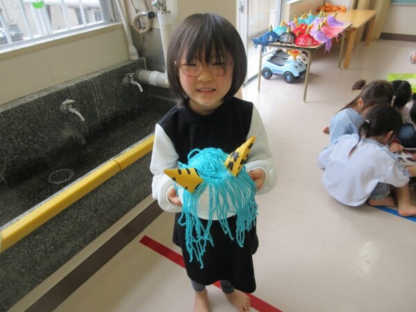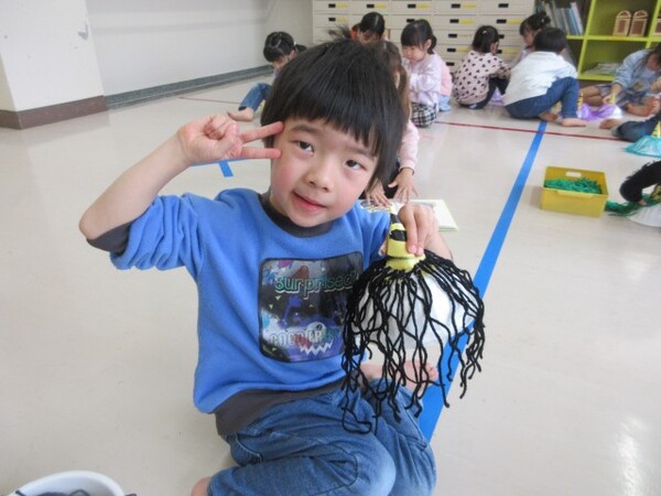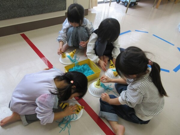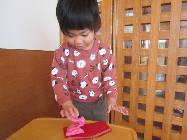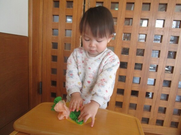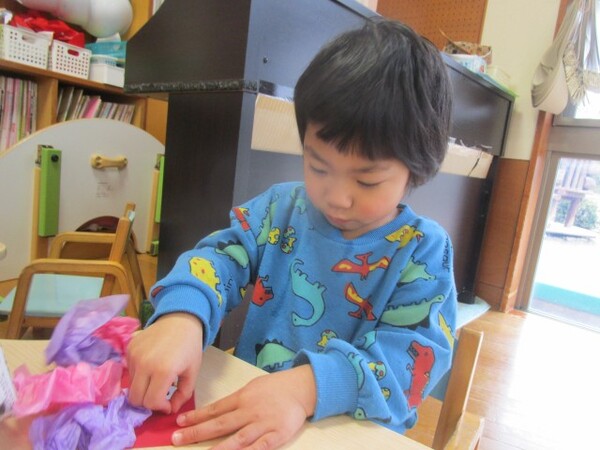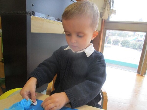 最初の製作「チューリップ」の時は、お花紙をぎゅぎゅっ!と小さくまとめる姿が多く見られましたが、今回の製作では、お花紙特有のふわふわ感を残して素敵な髪の毛にしてくれていました♪