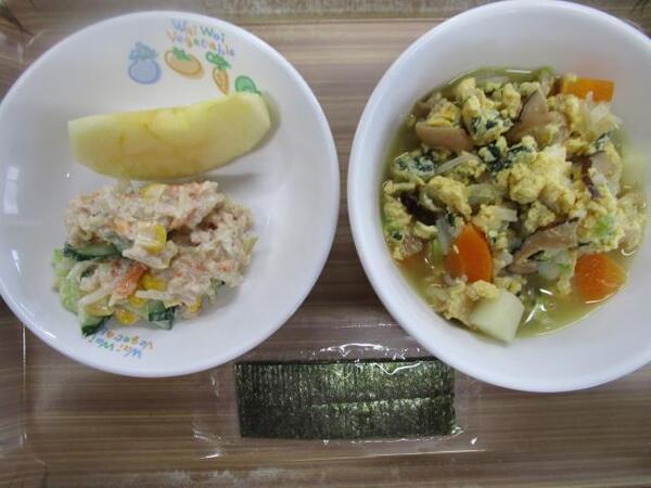 今日の給食は「魚の照り焼き・青菜のごまあえ・にら卵みそ汁【アレルギー対応メニュー みそ汁】」で〜す!