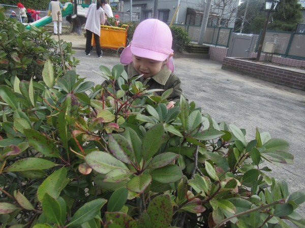 今日は、いつも遊んでいるすべり台側の地面に白いお花がたくさん咲いていることに気がつき、お友だちと一緒にモギモギ…。