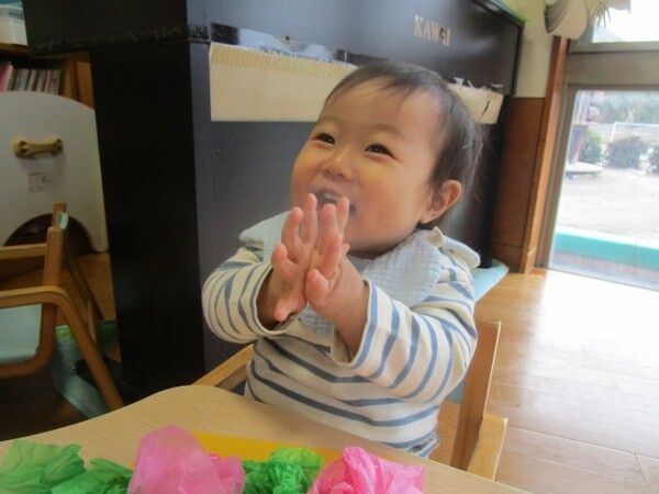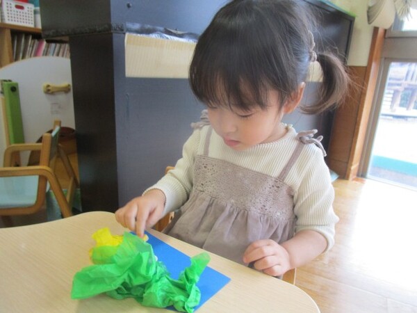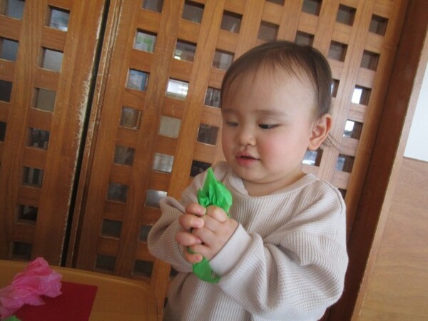 お花紙の感触を楽しみながら保育士の「クシャクシャ」の声かけにあわせて丸め、画用紙に「ぺたっ!」と声を出しながら貼っていました!