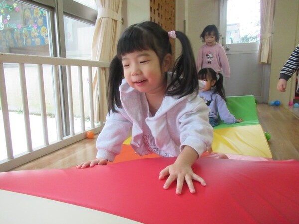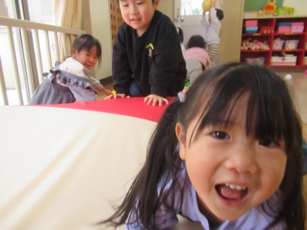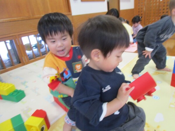 大きなブロックでは、自分たちでブロックを積んで乗り物を作り、お友だちと乗ってゆらゆらドライブを楽しんでいました♪