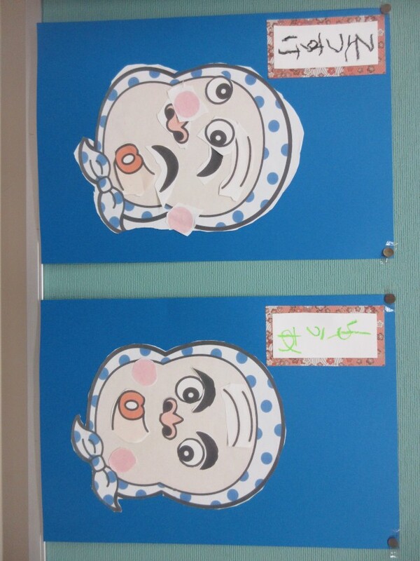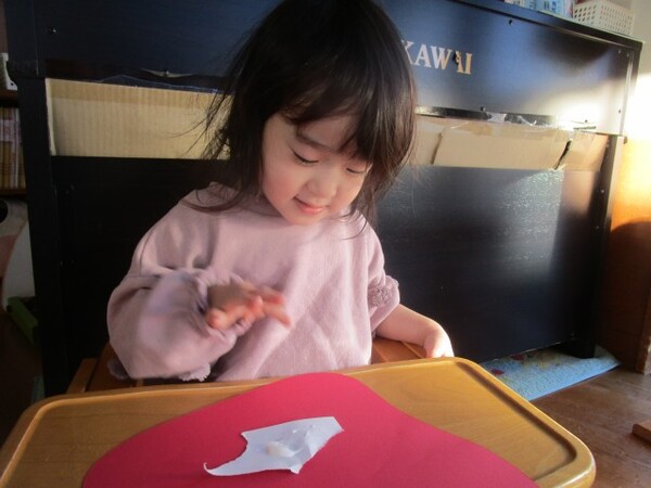 その後は、だるまの形の画用紙にのりを使って貼ってもらいました。