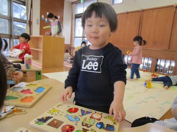 ポットン落としは、つぼみ組さんも遊べるようになってきていて、とても集中して穴に物を通して遊んでいました。