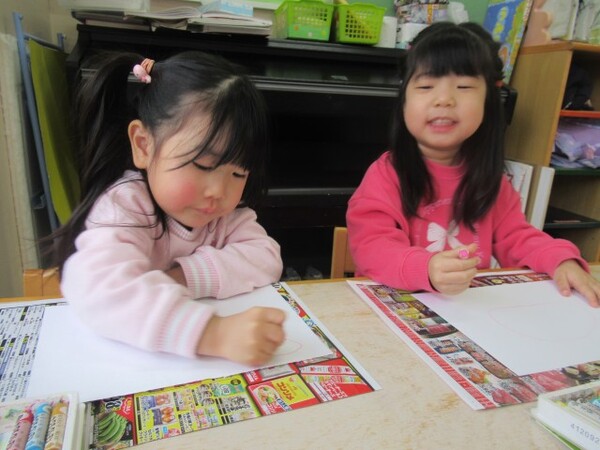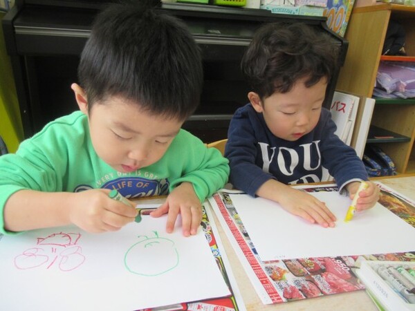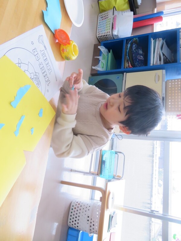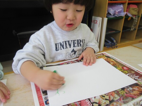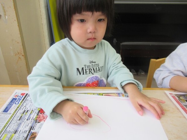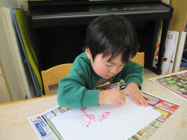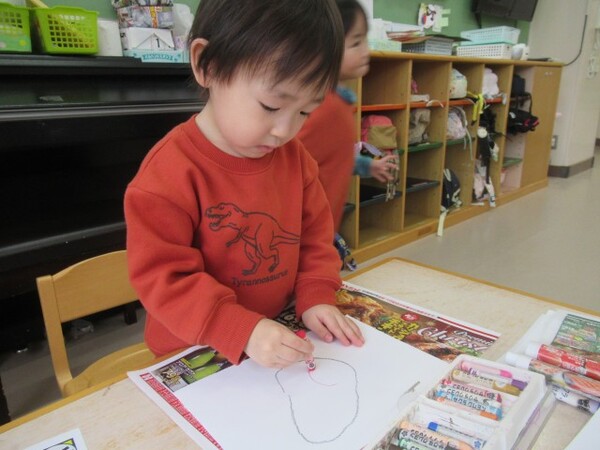 塗り絵の裏には、恐竜・家族・イルカなどみんなそれぞれ描きたいもの・好きなものを描いています♪