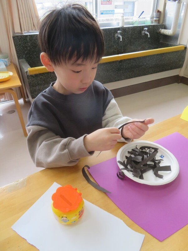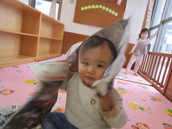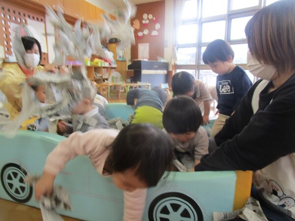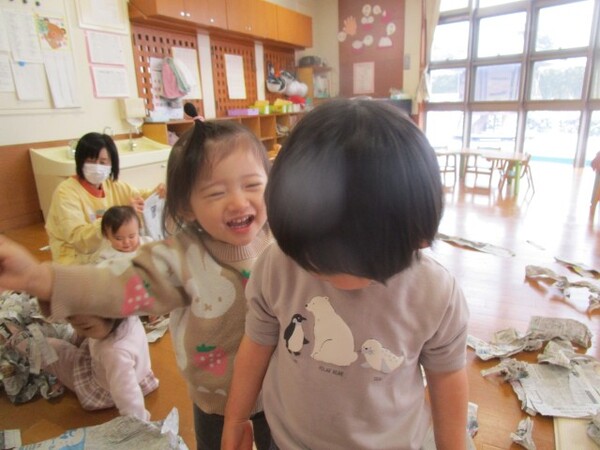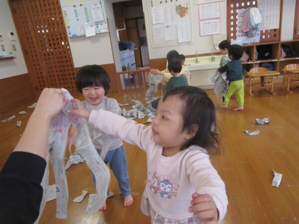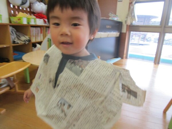 また新聞紙を破るだけでなく、クシャクシャを丸めてボールを作ったり、真ん中を切って頭を入れ、お洋服のようにして遊ぶ姿も見られました!