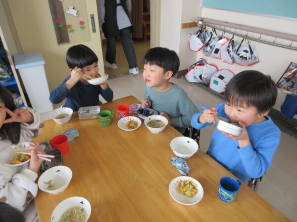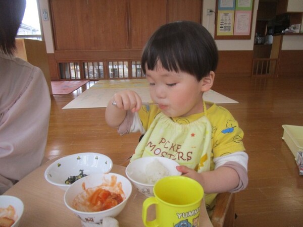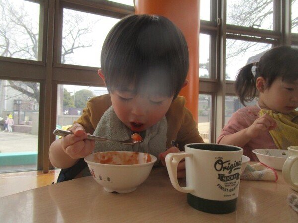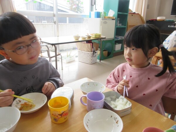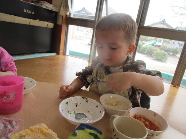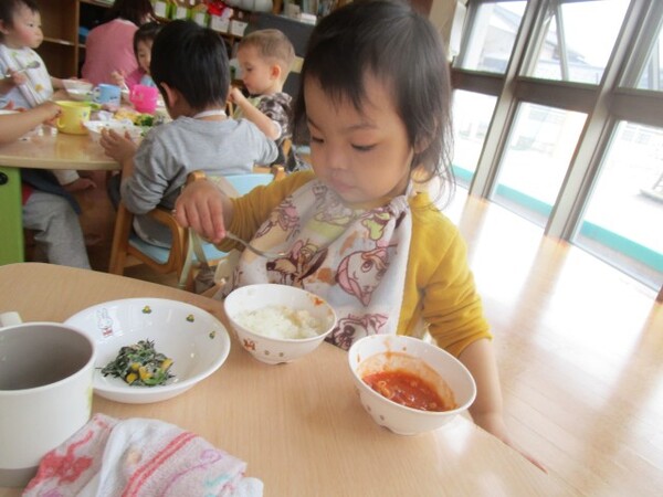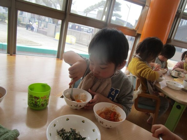 今日の給食は「ポークストロガノフ・ひじきサラダ・りんご」で〜す!