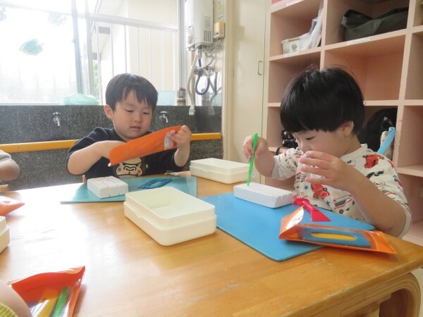 今日の給食は「魚の照り焼き・青菜のごまあえ・にら卵みそ汁【アレルギー対応メニュー みそ汁】」で〜す!
