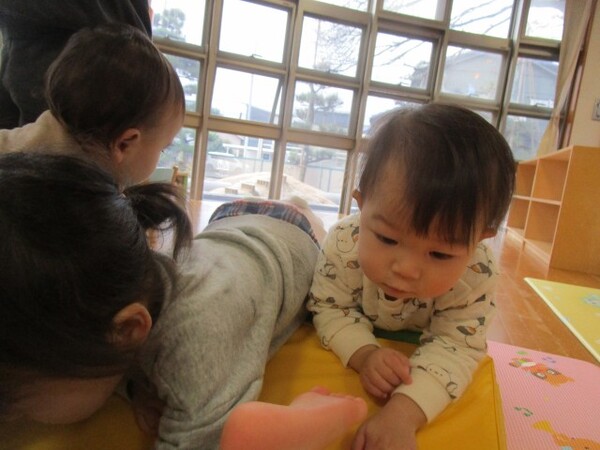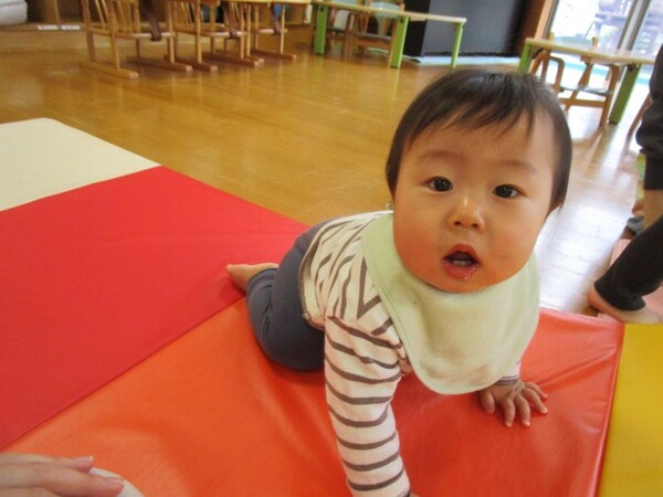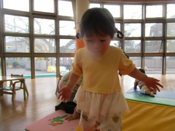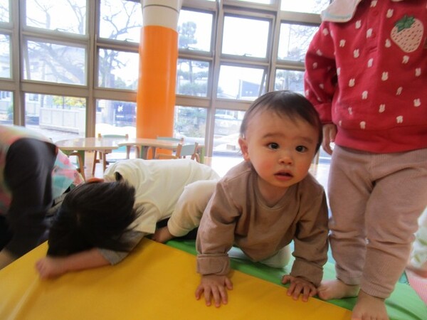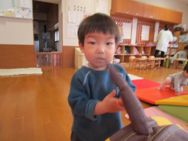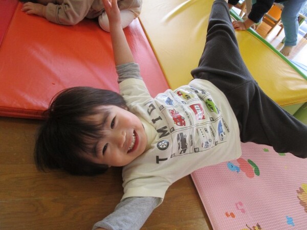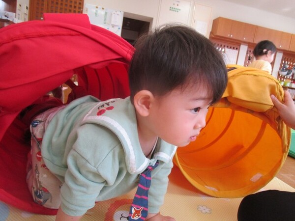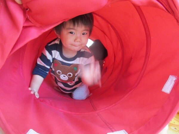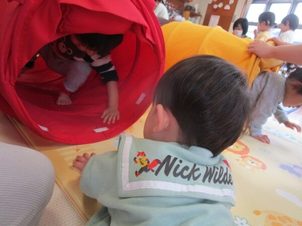 マットは「青から白に進んでね」、トンネルは「尻尾から入ってね」、平均台は「アンパンマンからワンワンに進んでね」と最初に伝え、守らないとお友だちとぶつかってしまい、痛い思いをしてしまうことをお話ししました。
