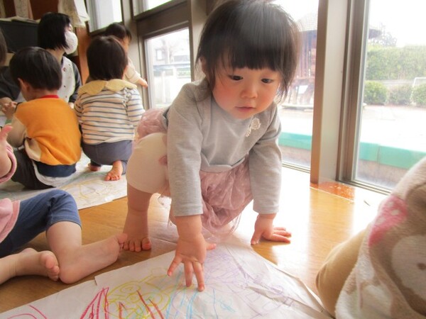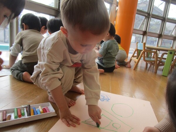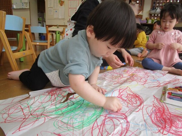 今日は、大きな紙にお絵描きをしました。