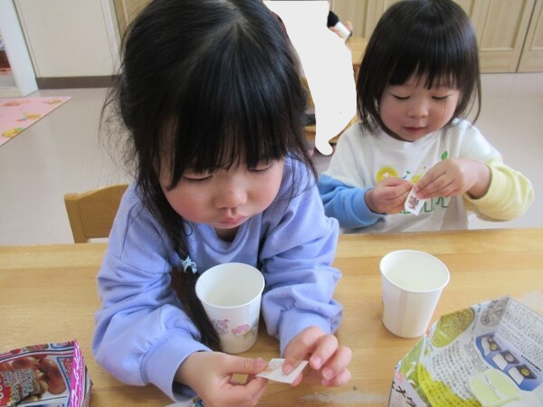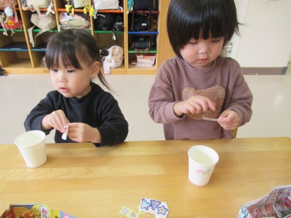 「のりだよ、少し触ってみる??」と聞くと、ツンツンしたり、少しひろげてみたりして、のりの感触を楽しんでいました♪