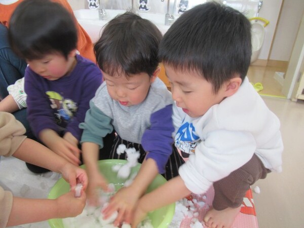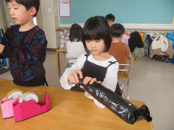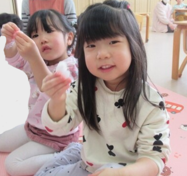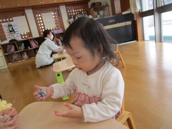 始める前に「いっぱい丸めると強い豆ができて鬼さんも倒せるんだよ!」とお話しし、投げてみると大盛り上がりの子どもたち♪