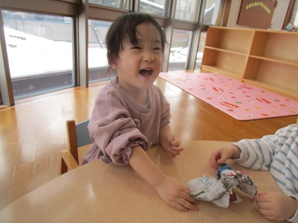 今日は、節分に向けて新聞紙を小さく丸めて豆を作りました。