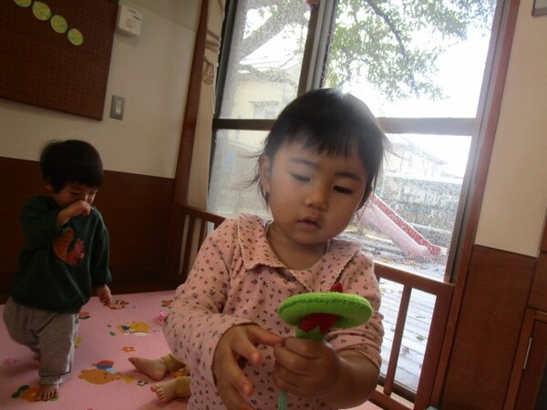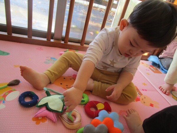 ひも通しでは、今まではひもに通さず穴を覗いたり、通すものを集めたりする姿が多く見られていましたが、手元をよく見て穴にひもを通して遊ぶ姿が少しずつ見られるようになってきました。