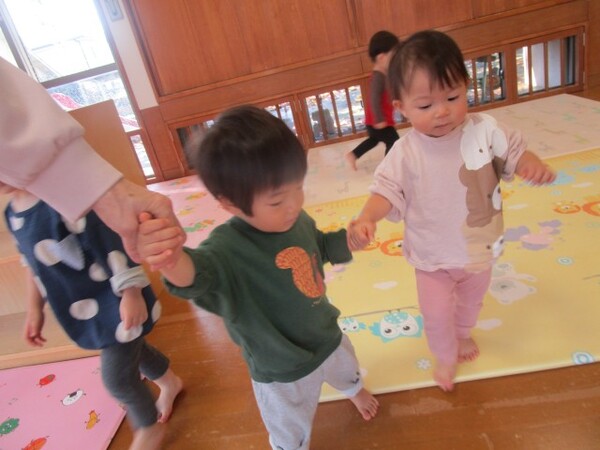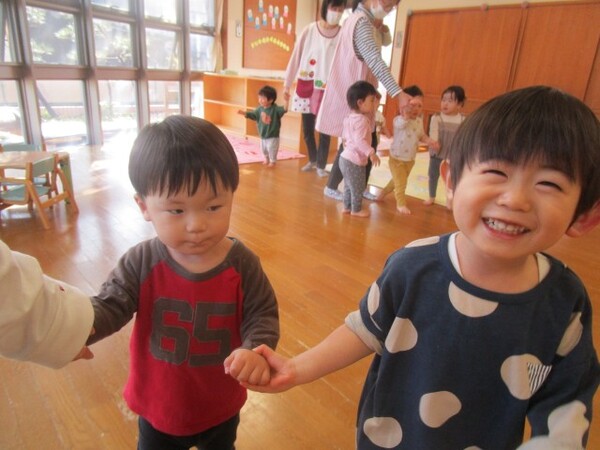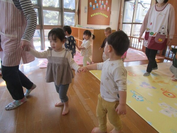ピアノの音、流れている歌に乗りながらお友だちと歩くことを楽しんでいます♪