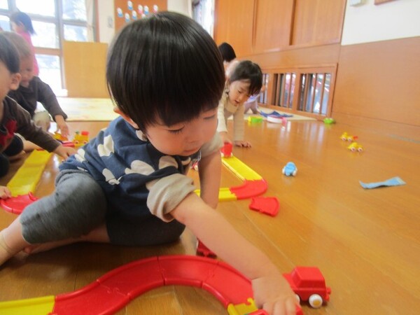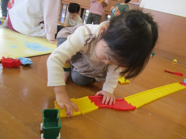 車を走らせるための道路は、最初に保育士が見本を見せ、子どもたちが好きなように道を作ったり、自分で考えながら壊れた道をつなげられるように見守り、サポートしています。