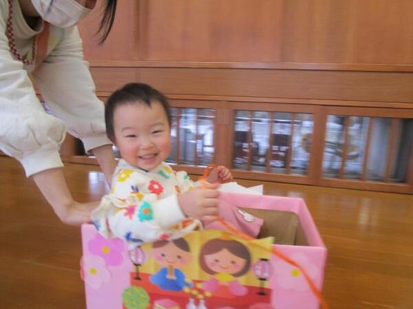 今日は、ひまわり組さんとあやめ組さんと豆まきをしました。オニの帽子、オニのベルトをつけ、新聞紙を丸めた豆をますにいれ、準備完了!!