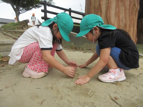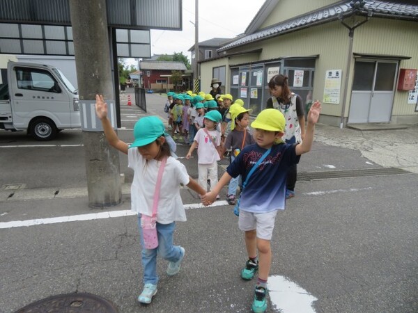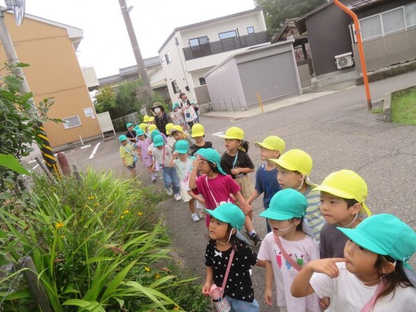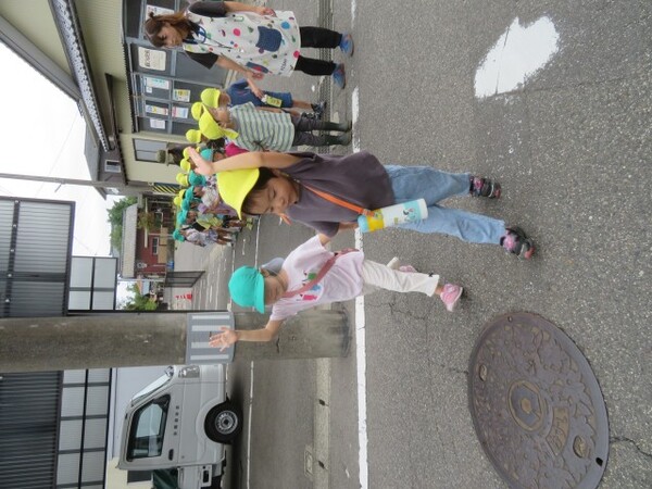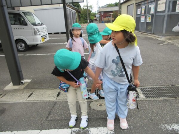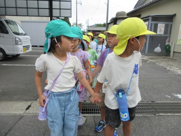 あやめ組さんと手をつなぎ、それぞれのペアでお話ししながら歩いていた子どもたち。