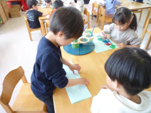 保育者が転がすボールにあたらないよう、「きゃ〜」と逃げていました。お絵描きでは、「好きなものを描いていいよ」と伝えました。果物や乗り物、お家の人の顔など、それぞれが描きたいものを描いていました。