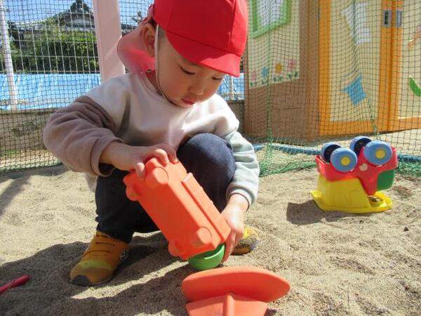 「触ってみていいよ」と声をかけると、みんなまずは寒天に・・・♬指でツンツン触る子が多かったです。そのあと透明カップやスプーン、お椀などを持ってきて、好きな色の寒天を混ぜて楽しみました。2色の寒天を混ぜると「みどりになった〜」など色の変化も楽しんでいた子どもたちです。手で握ってつぶすことも楽しんでいました。