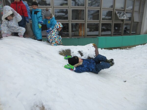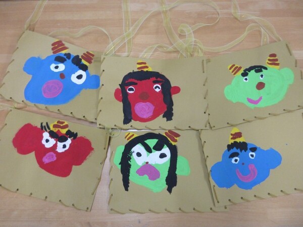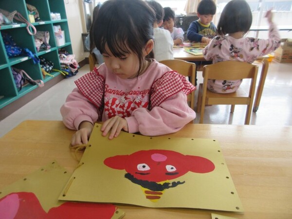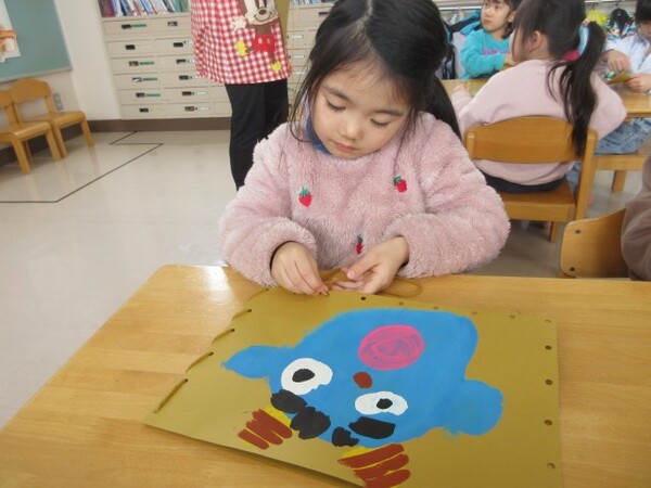 始める前に「いっぱい丸めると強い豆ができて鬼さんも倒せるんだよ!」とお話しし、投げてみると大盛り上がりの子どもたち♪