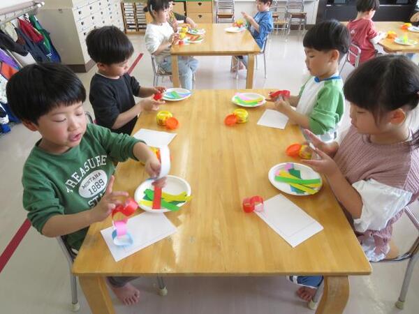 できあがるとお友だちと見せ合って、今日もニコニコ楽しんでいた子どもたちです!