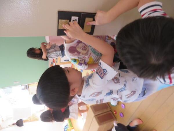 まずは、カードに自分の名前を書きました。名前のお手本を用意していたので、それを見ながら書く子、「見なくても書ける〜」と自分で書き進める子がいました。これから、自分の名前を書く機会を増やしていきたいと思います。