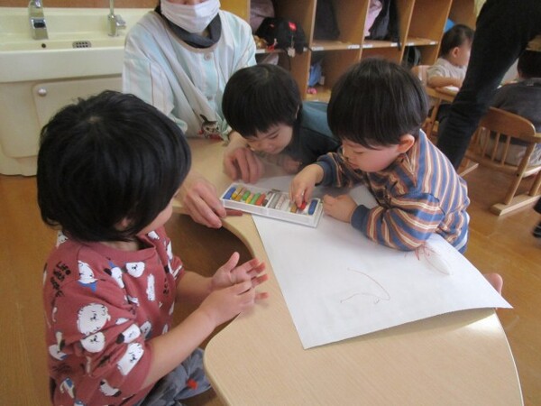みんな頭の中で自分の描きたいものがイメージできているようで「アンパンマン…」「新幹線!!」とものの名前をつぶやきながら描いたり、できあがると「できた〜☆」とニコニコ笑顔で保育士に教えたりしてくれました♪