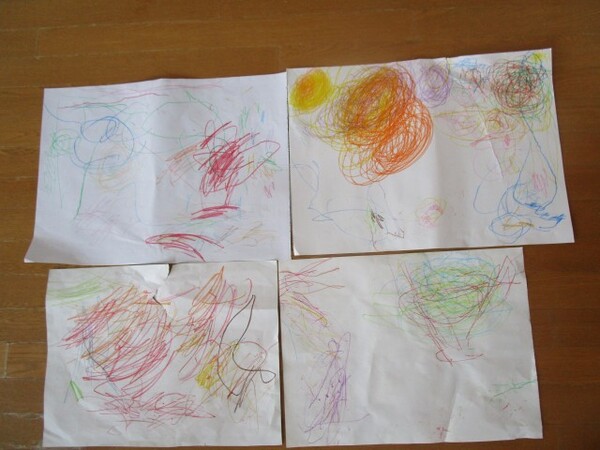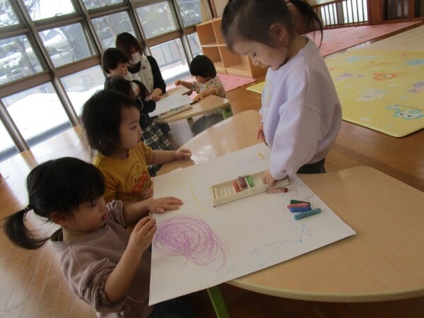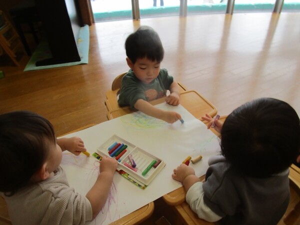 今日は、お友だちと一緒の紙でお絵描きをしました。