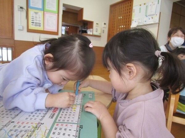 後ろは、カレンダーになっていて、小さな四角の中を塗ったり、描いてある絵をみてお話をしたりしてお友だちと一緒に楽しんでいました。