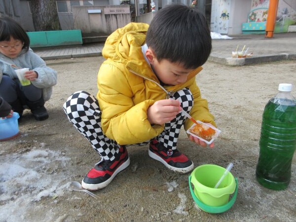 また、雪を使ってのおままごとでは水や砂・葉っぱ・石・枝など様々な自然物を使って