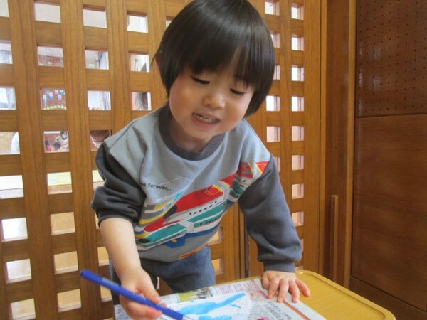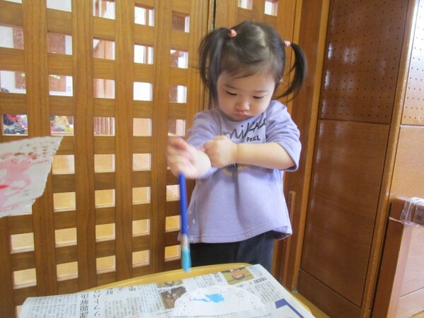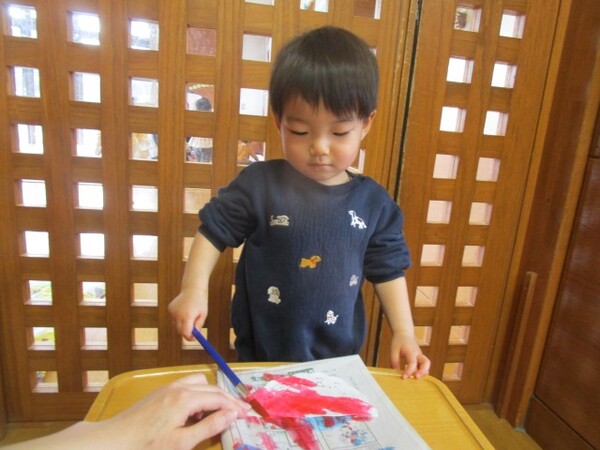 いつも塗り絵で使っているクレヨンに比べ、筆は長く、大きいので最初は難しそうにしていましたが「ぬりぬり、こうだよ!」と一緒にして見せると自分の持ちやすい持ち方を見つけて「ぬりぬり…」「あか!あお!!いっぱい〜!!!」と口にしながら上手に色をつけていました!