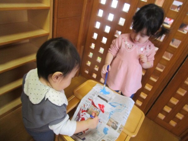 今日は、白色のレースペーパーに筆を使って、赤・青の絵の具で色をつけ、おひな様をおだいり様のお洋服をつくりました。